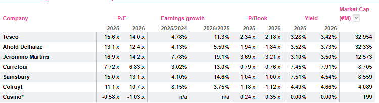 Tesco is the clear leader in the UK market and benefits from an environment where food inflation remains elevated. It is considered as a hedge against inflation. Valuation is now becoming somewhat expensive with a PE 26 (Feb 26) of 15.6x down to 13.1 in 2028 (feb) but market share gain is the name of the game in food retail and Tesco has been now consistently gaining market shares for years in an environment where others (Asda notably) were struggling.